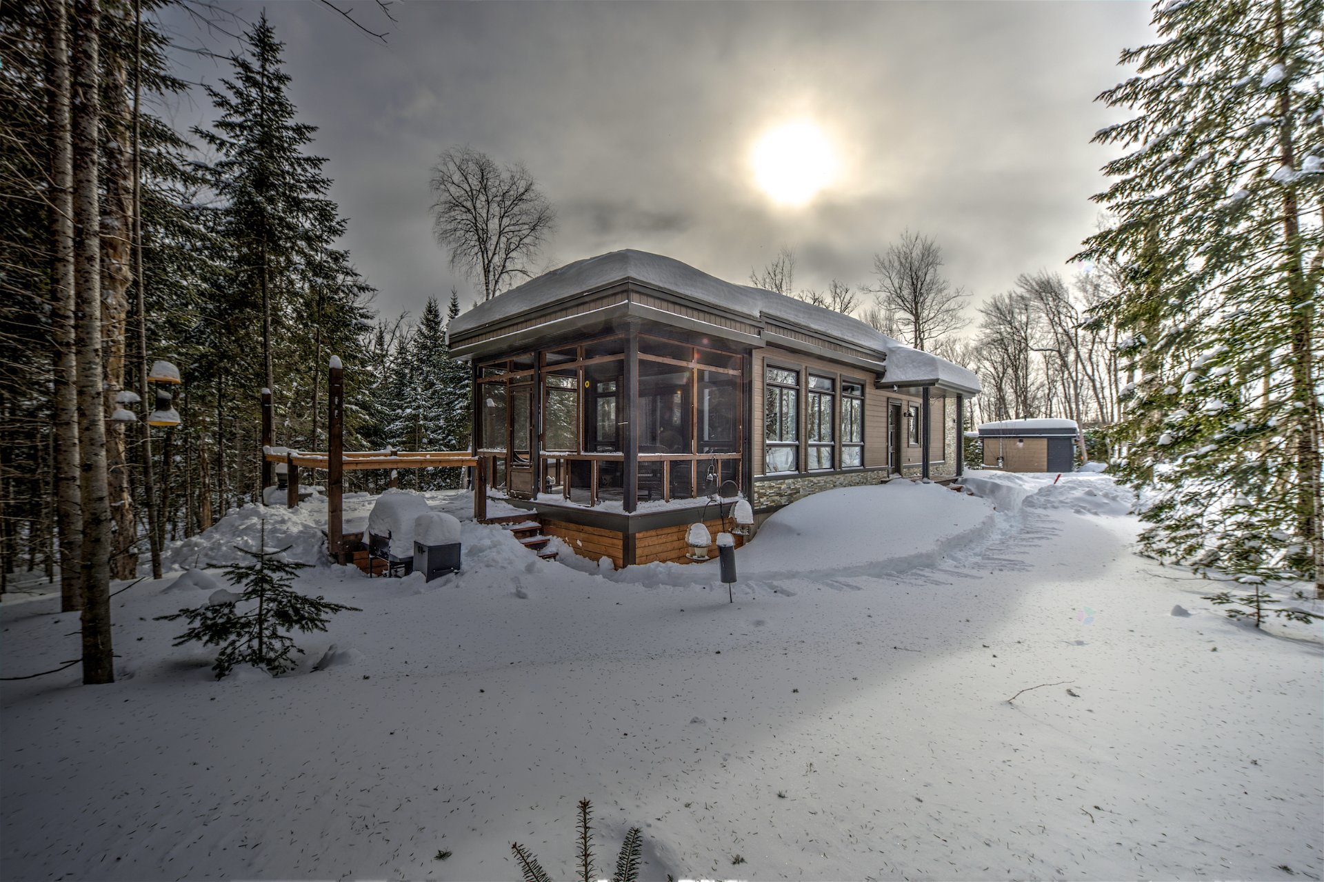 - Cadre naturel — Dans les Laurentides, les minimaisons s’intègrent harmonieusement aux terrains boisés, aux montagnes et aux lacs.